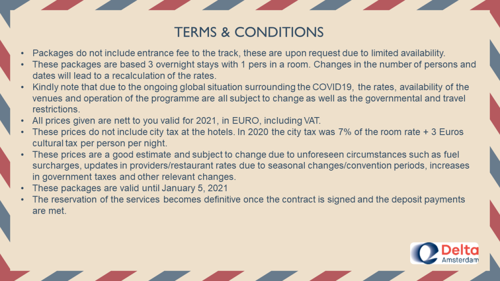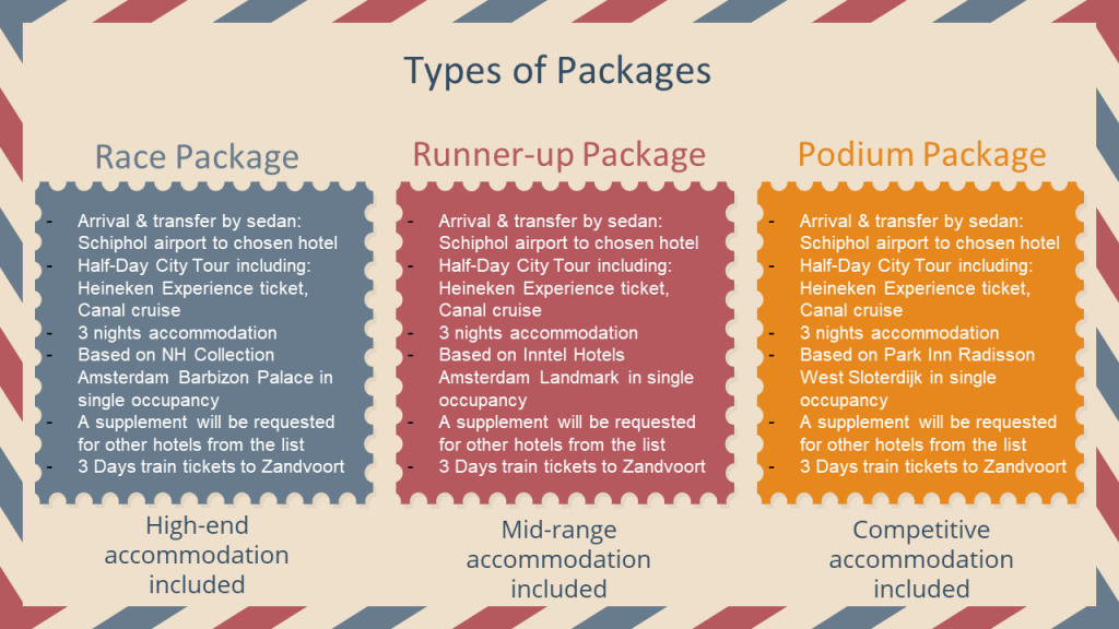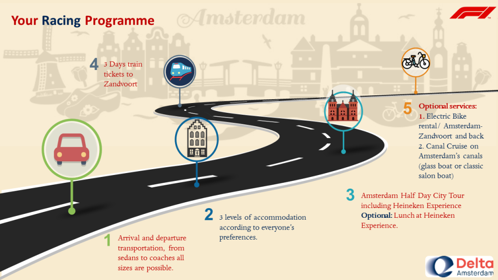 The exciting racing event is coming back to The Netherlands next year after more than 25 years. The Netherlands will be hosting a Dutch Formula 1 Grand Prix in Zandvoort Circuit between 23-25 August 2024. In a joint effort with our team & partners, we have put together with utmost care some fantastic packages for you, in every category to fit your needs.